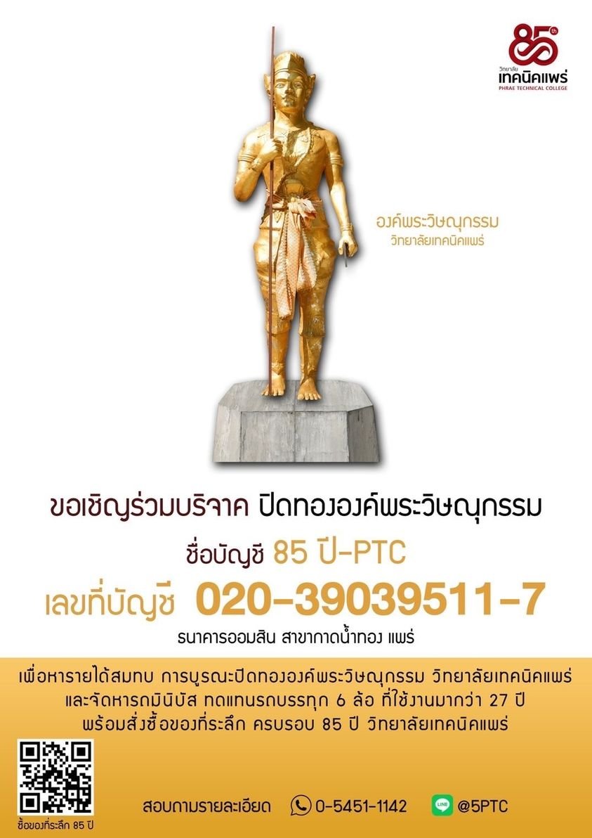ขอเชิญร่วมบริจาคปิดทององค์พระวิษณุกรรม วิทยาลัยเทคนิคแพร่ เพื่อหารายได้สมทบการบูรณะปิดทององค์พระวิษณุกรรม และจัดหารถมินิบัสทดแทนรถบรรทุก 6 ล้อที่ใช้งานมามากกว่า 27 ปี