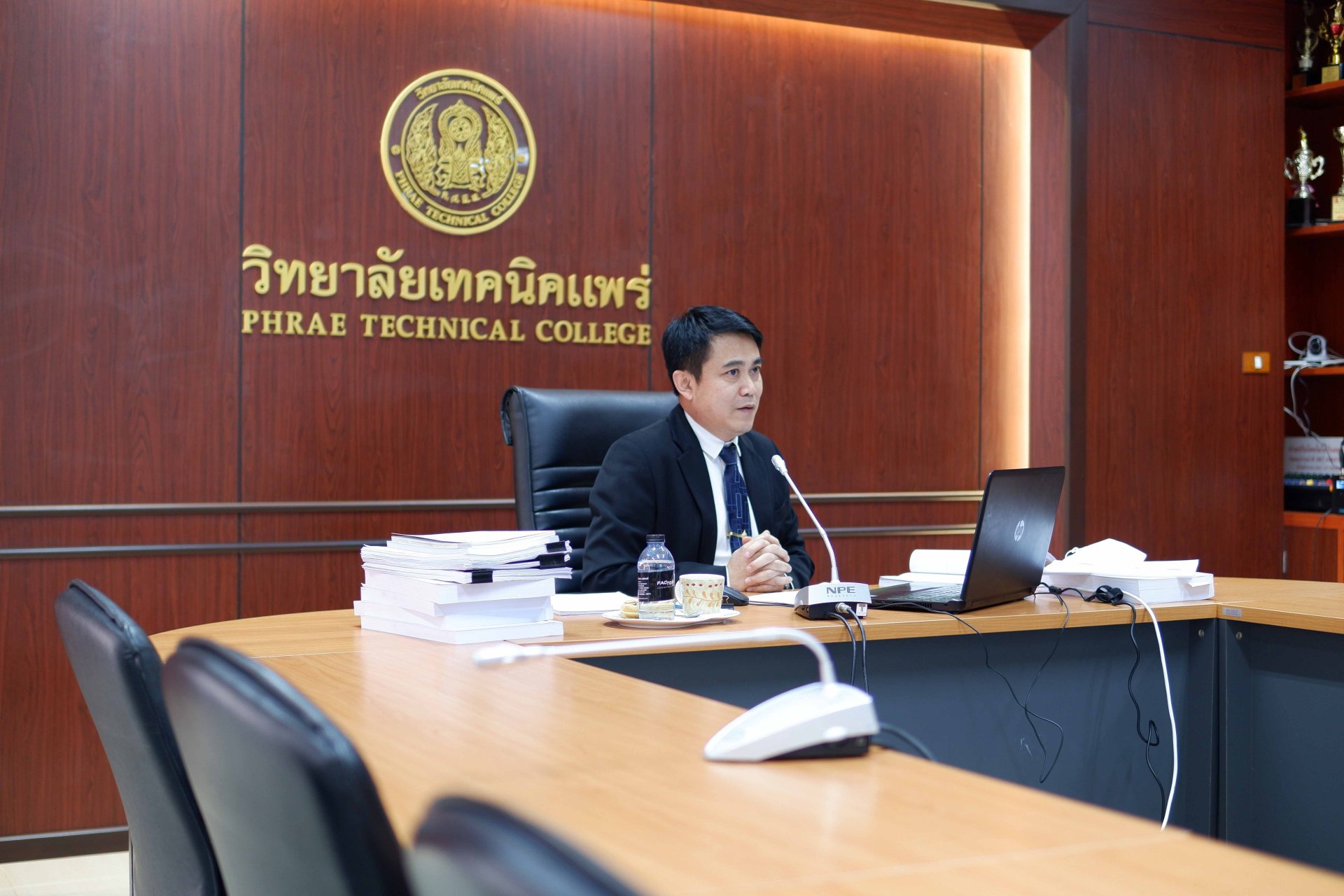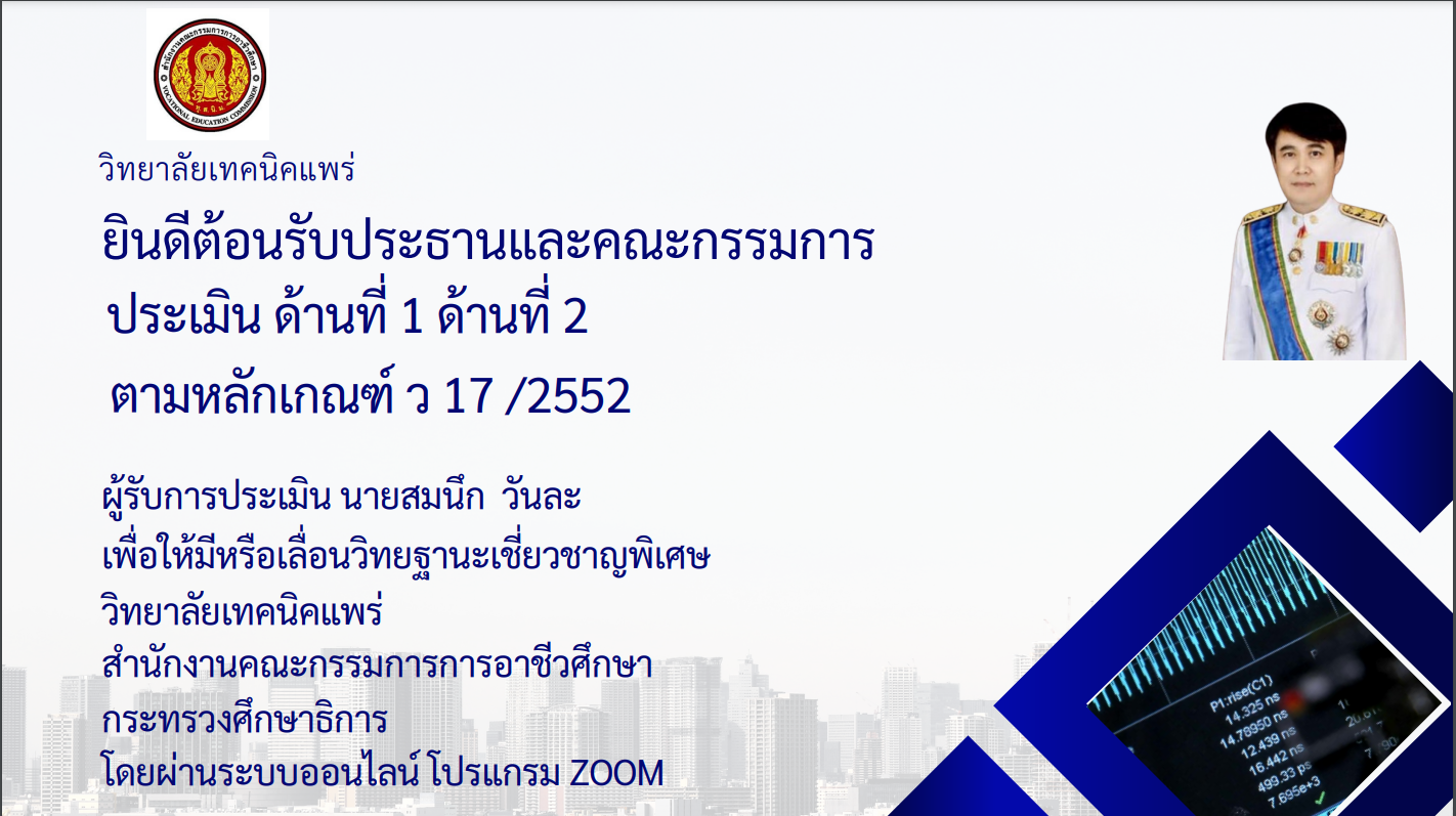 ครูสมนึก วันละ ครูแผนกวิชาอิเล็กทรอนิกส์ ขอรับการประเมินเพื่อให้มีหรือเลื่อนวิทยฐานะเชี่ยวชาญพิเศษ (คศ.5) โดยมีคณะกรรมการ ผู้ทรงคุณวุฒิ จากสำนักงานคณะกรรมการข้าราชการครูและบุคลากรทางการศึกษา (ก.ค.ศ.) สำนักงานคณะกรรมการการอาชีวศึกษา (สอศ.) กระทรวงศึกษาธิการ ผ่านระบบออนไลน์ ณ ห้องเกียรติยศ วิทยาลัยเทคนิคแพร่