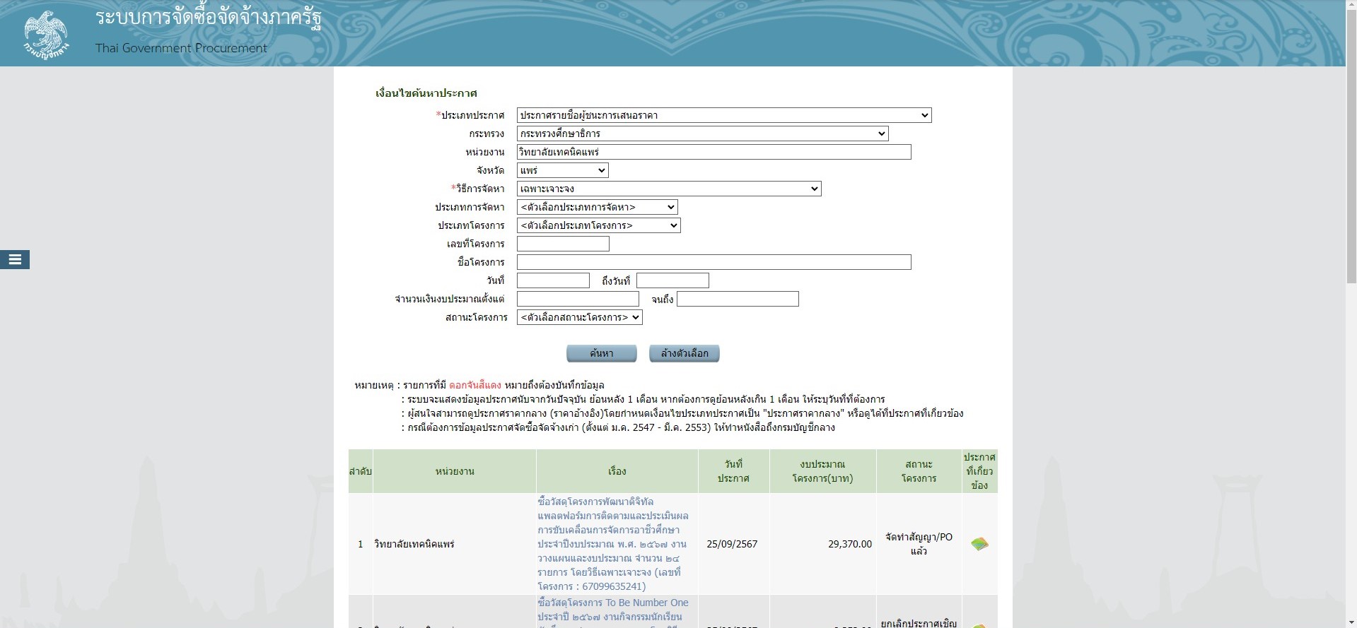 หมายเหตุ : ตามหนังสือกรมบัญชีกลางที่ กค 0433.4/ว 568 ลงวันที่ 30 พฤศจิกายน 2563 เพื่อลดความซ้ำซ้อนของการจัดทำข้อมูลสรุปผลการดำเนินการจัดซื้อจัดจ้าง กรมบัญชีกลางจึงปรับปรุงประกาศข้อมูลสาระสำคัญในสัญญา ในระบบการจัดซื้อจัดจ้างภาครัฐด้วยอิเล็กทรอนิกส์ (e-GP)