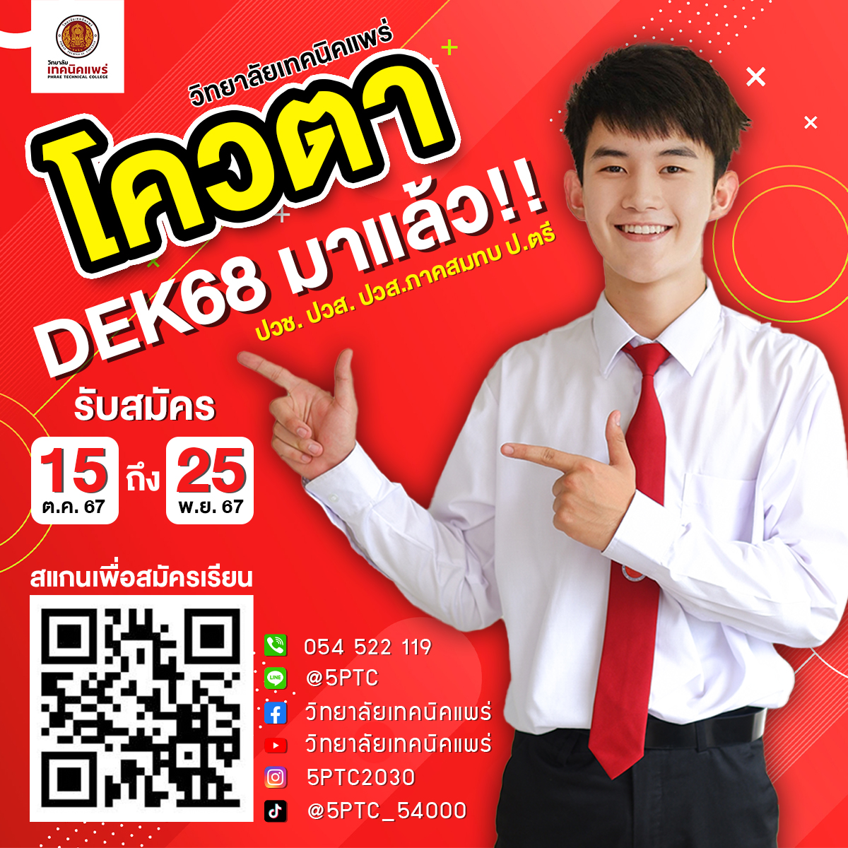 อ่านประกาศ https://www.technicphrae.ac.th/content/29476/ประกาศวิทยาลัยเทคนิคแพร่-เรื่อง-การรับสมัคร-นักเรียน-นักศึกษา-โควตา-ระดับ-ปวช-ปวส-ปวสภาคสมทบ-และปริญญาตรี-ประจำปีการศึกษา-2568