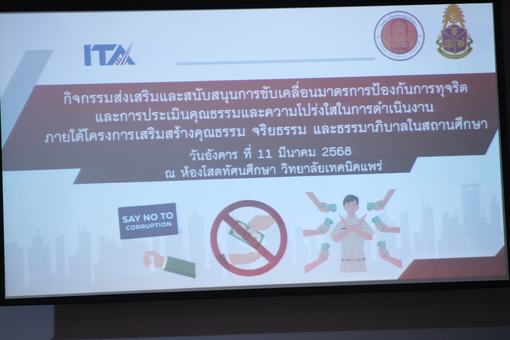 วันอังคาร ที่ 11 มีนาคม 2568 วิทยาลัยเทคนิคแพร่ จัดกิจกรรมส่งเสริมและสนับสนุนการขับเคลื่อนมาตรการป้องกันการทุจริต และการประเมินคุณธรรมและความโปร่งใสในการดำเนินงาน ภายใต้โครงการเสริมสร้างคุณธรรม จริยธรรม และธรรมาภิบาล ในสถานศึกษา โดยมีคณะ ผู้บริหาร ครูและบุคลากรทางการศึกษา เข้าร่วมกิจกรรม ดังกล่าว ณ ห้องโสตทัศนศึกษา วิทยาลัยเทคนิคแพร่