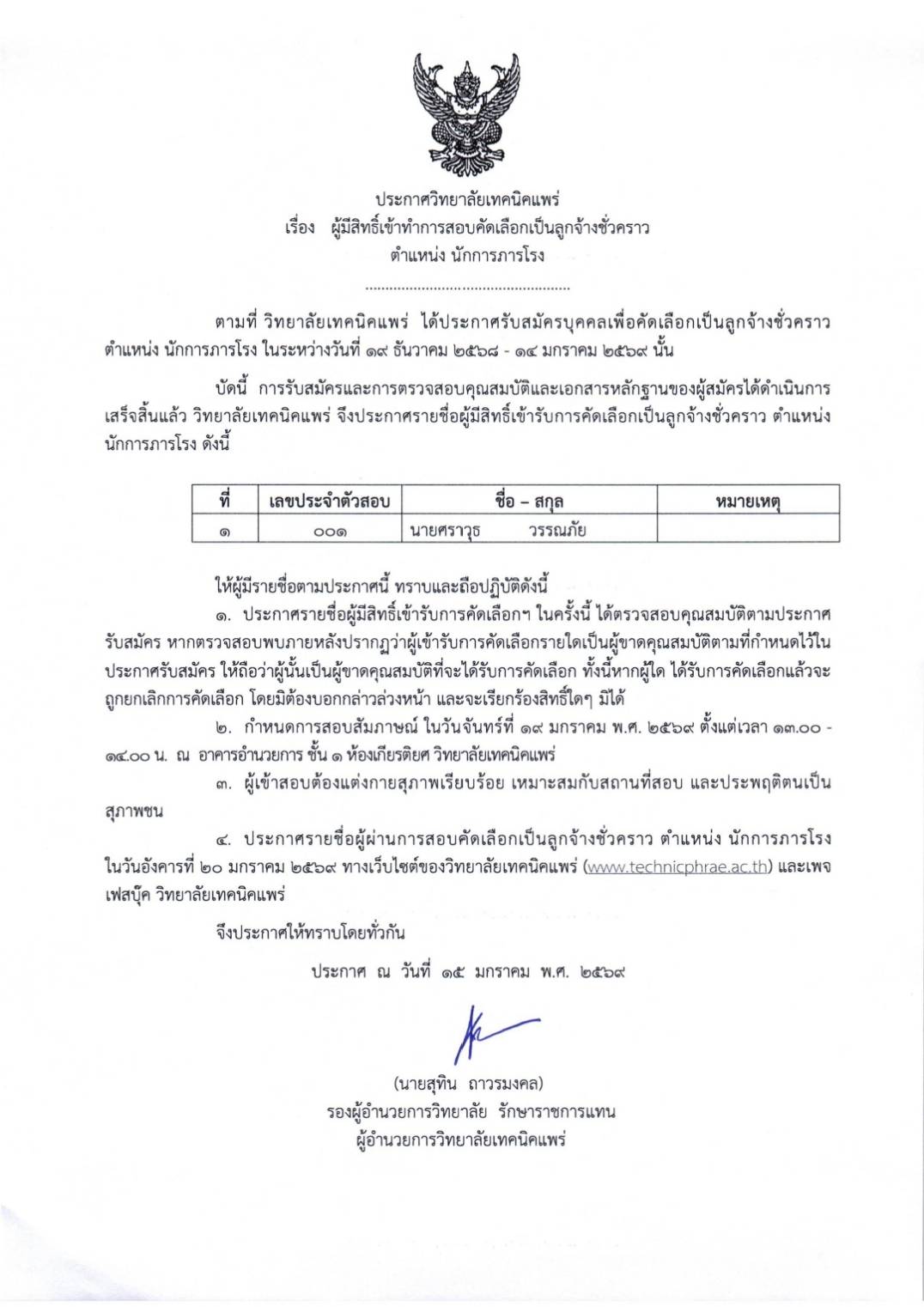 เรื่อง การเรียกตัวผู้ผ่านการคัดเลือกเป็นลูกจ้างชั่วคราว ตำแหน่งเจ้าหน้าที่งานพัสดุ ลำดับที่ 2 แทนผู้สละสิทธิ์มารายงานตัว