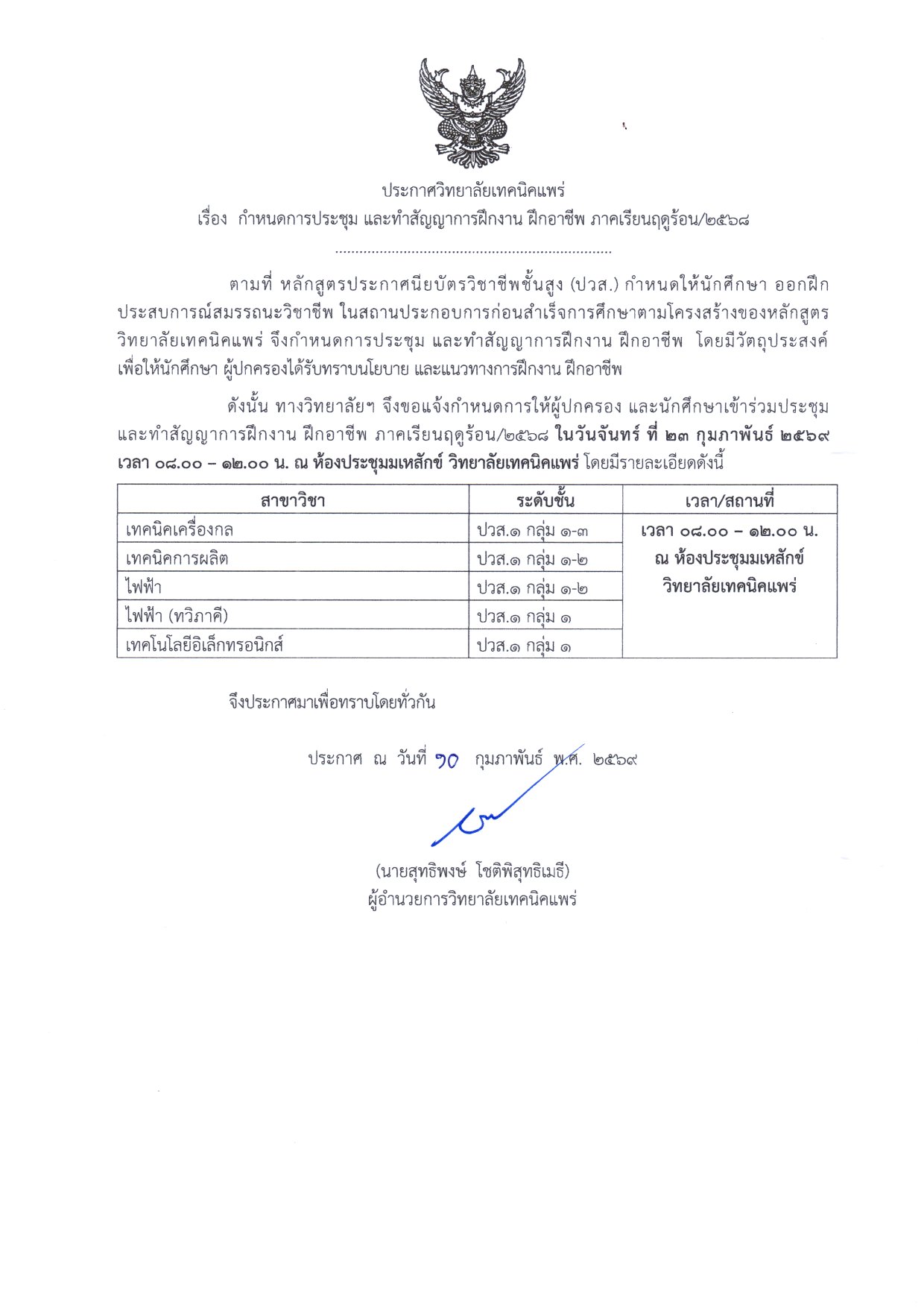 กำหนดการประชุม และทำสัญญาฝึกงาน ฝึกอาชีพ ภาคเรียนฤดูร้อน/2568